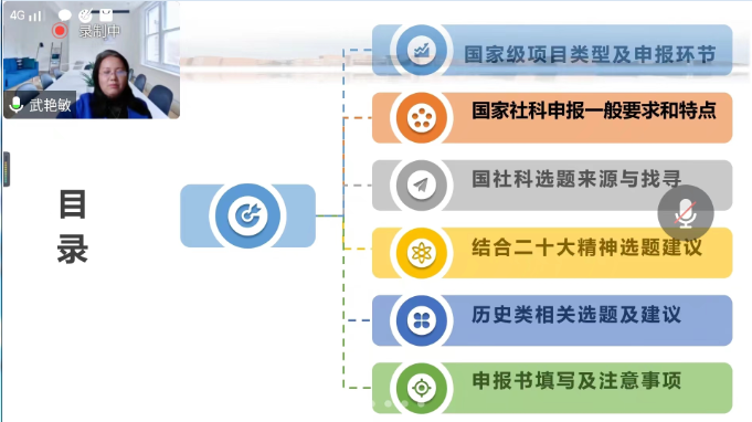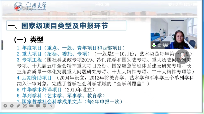 武艳敏教授首先介绍了国家级项目类型及申报环节,指出只有熟悉各类项目特点及申报流程才能做到事半功倍;接着,武教授就suncitygroup太阳新城教师国家社科基金项目的选题来源给出了新思路,她建议老师们要认真研习二十大报告精神,结合自身研究方向,选择符合 “现代化”背景的课题;最后,武教授就国社科申报书的填写及注意事项给出了建设性的指导。