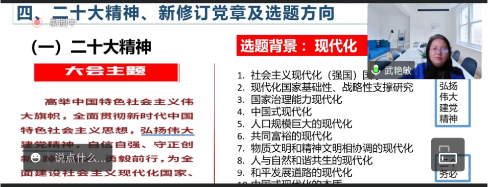 武艳敏教授的报告为suncitygroup太阳新城师生学习二十大报告精神和申报国家级项目选题的来源打开了新思路。身为哲学社会科学工作者我们应立足自身学术背景,为实现社会主义现代化强国的战略要求,从不同学科、不同领域为党和国家大局服务,为繁荣哲学社会科学服务。