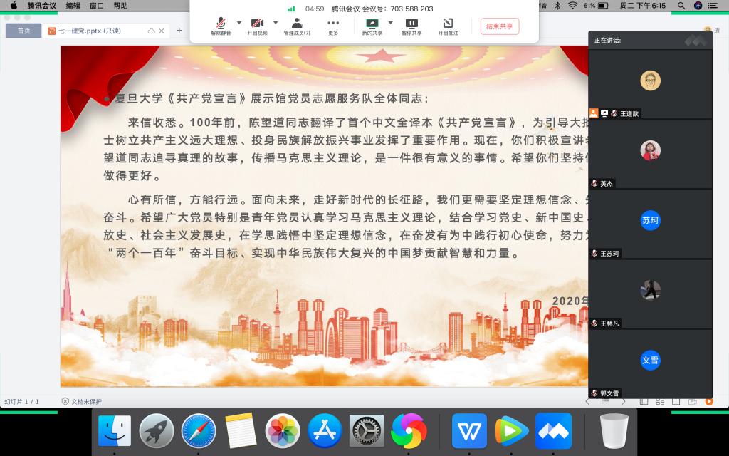 6月30日下午,学生党员二支部组织通过在线形式组织开展了学习习近平总书记给复旦大学青年师生党员回信精神主题活动,会议由支部书记王道歆主持。