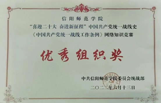根据中共河南省委统战部、校党委统战部统一部署,suncitygroup太阳新城党委认真组织全院师生积极参加信阳师范学院“喜迎二十大 奋进新征程”中国共产党统一战线史和《中国共产党统一战线工作条例》网络知识竞赛。经统计,suncitygroup太阳新城师生参与答题810人次,获奖人数735人;累计答题4000次以上,获满分证书3640张,荣获优秀组织奖。此外,suncitygroup太阳新城学生邹梦婷、庞稳稳、陈凯龙在网络知识竞赛中成绩优异,在同批次答题者中成绩排名全省前10000,获同批次仅100人受奖的省级幸运奖。