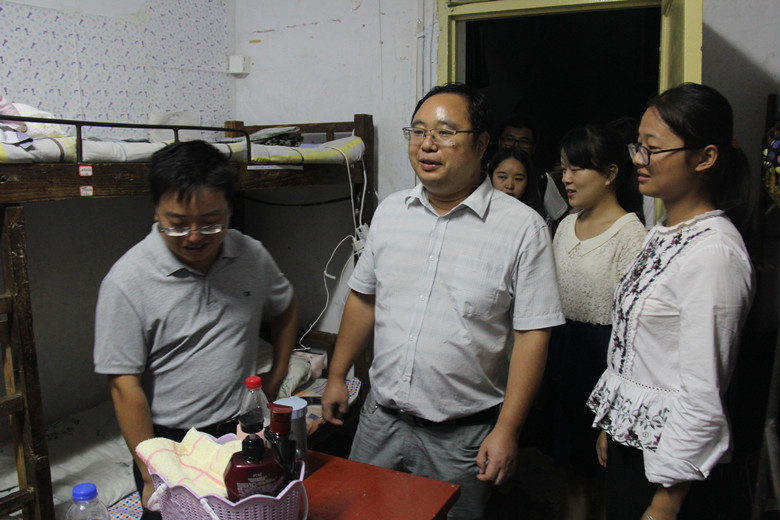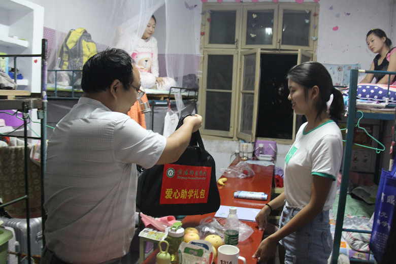 9月11日,新生报到后的第一天,受suncitygroup太阳新城党委书记李军辉、院长尹全海委托,党委副书记刘喜元和2017级新生班主任一起前往宿舍,看望慰问家庭经济困难新生,为困难新生送上一份“爱心大礼包”。