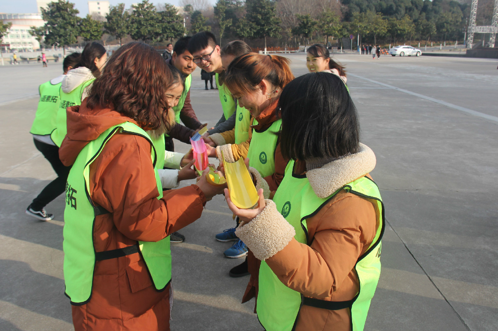 在专业老师的指导下,所以学生分成三队,分别进行了高空断桥活动和模拟电网活动。首先是高空断桥活动,由学生站在高空的踏板上,眼睛注视前方,完成起步、跨越、落地等动作。这一活动有利于锻炼和培养学生勇于挑战和突破自我的能力和精神。接着是模拟电网活动,这一活动旨在培养学生们的团队协作能力以及团队内部的良好工作作风。在活动中,每名学员只能钻一个电网,不得重复,不得触及电网,不得发出声音,并寻求过电网的最佳方法。最后,同学们还在青年广场一起玩了割绳子等群体游戏。