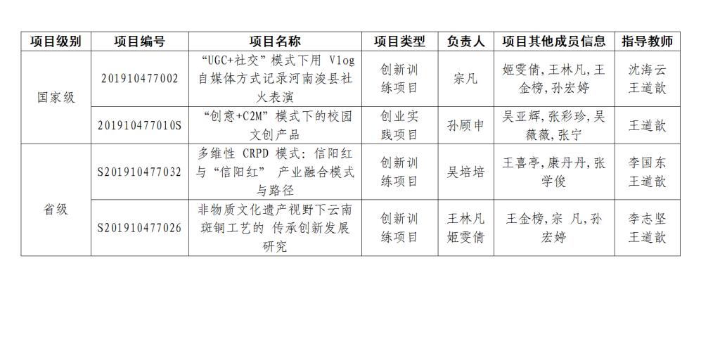 suncitygroup太阳新城获批两项分别为李国东、王道歆老师指导,吴培培、王喜亭、康丹丹、张学俊为项目组成员的《多维性CRPD模式:信阳红与“信阳红”产业融合模式与路径》;由李志坚、王道歆老师指导,王林凡、姬雯倩、王金榜、宗凡、孙宏婷为项目组成员的《非物质文化遗产视野下云南斑铜工艺的传承创新发展研究》。