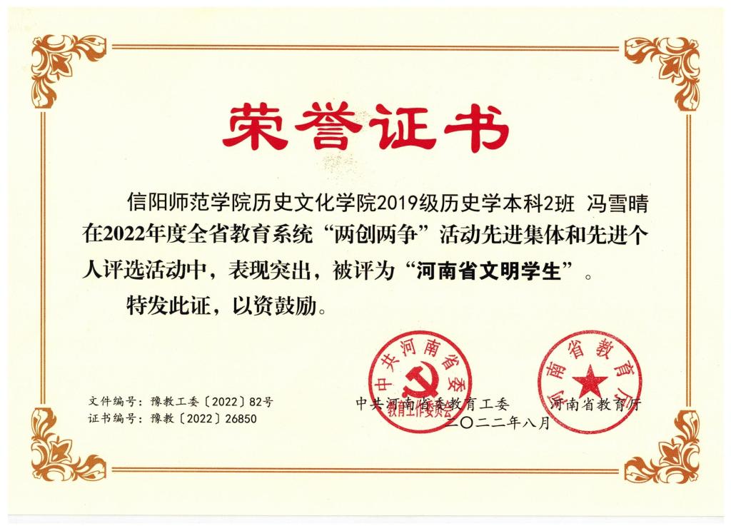 近日,中共河南省委教育工委、河南省教育厅关于开展2022年度“两创两争”活动先进个人评选活动结果揭晓。suncitygroup太阳新城优秀学子2019级历史学二班冯雪晴获河南省“文明学生”荣誉称号。