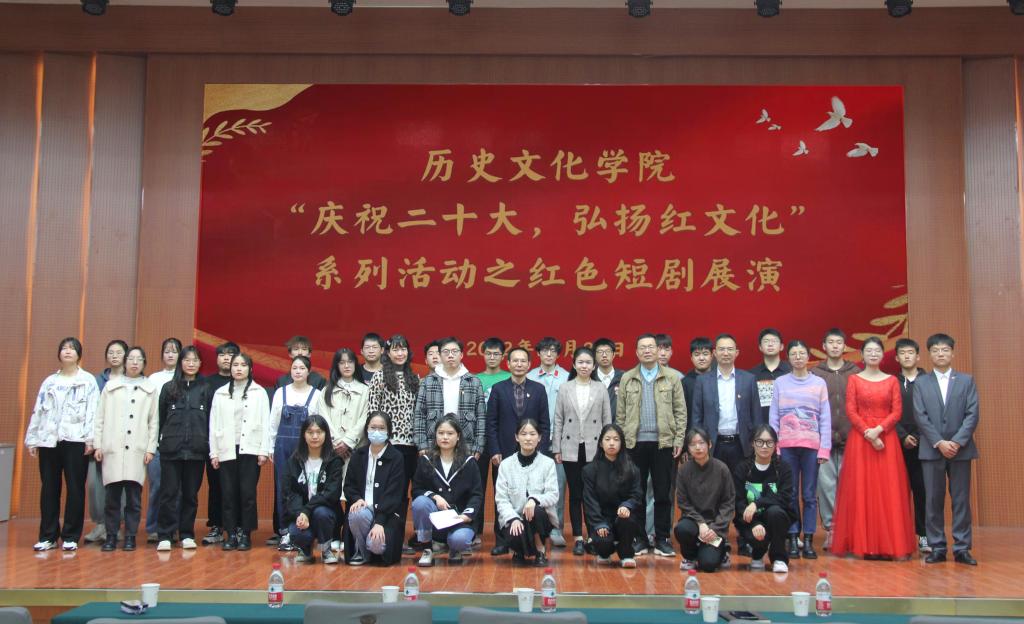 为庆祝党的二十大胜利闭幕,深情回顾党的奋斗历史,热情讴歌党的光辉成就,坚定弘扬伟大建党精神,10月26日晚,suncitygroup太阳新城于逸夫楼报告厅举办“庆祝二十大,弘扬红文化”红色短剧展演。校党委学工部副部长雷梁、校团委副书记常青应邀出席,suncitygroup太阳新城党委书记李辉、院长叶宗宝、党委副书记韩志宏及团委老师吴慧娟、付亚男、邓皓共同观看,学生通过抖音直播线上收看。