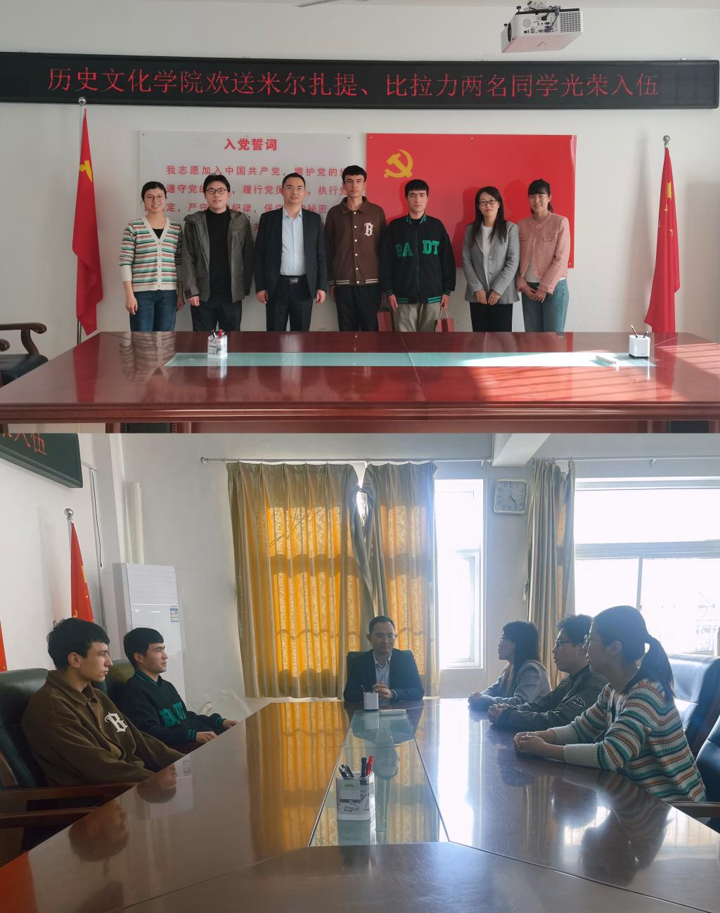 3月14日下午,suncitygroup太阳新城举行欢送2022级学生米尔扎提、比拉力光荣入伍仪式,学院党委副书记韩志宏、辅导员班主任吴慧娟、付亚男、邓皓、邹维一参会。