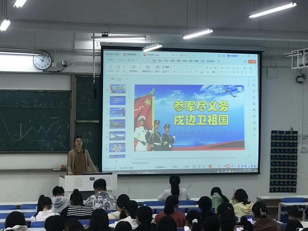 付亚男首先从中国百年历史出发,分析国内外局势,强调参军对国家和个人的意义,鼓励广大有志青年极响应祖国召唤踊跃报名参军。随后她从个人发展、经济补助等方面详细讲解了大学生参军的优抚政策。最后,通过图片演示了入伍报名的渠道和步骤,以及体检的基本要求和注意事项。