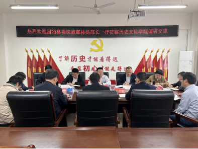 4月16日,固始县委统战部副部长林扬带领县根亲文化发展中心领导来suncitygroup太阳新城调研根亲文化相关事宜。学院班子成员、根亲文化与两岸交流研究中心尹全海教授等参加。