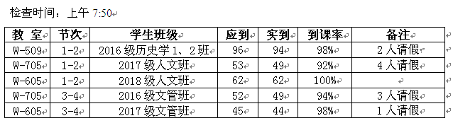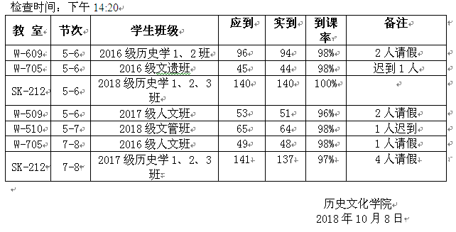 为进一步规范教学管理,维护正常教学秩序,确保教学工作顺利开展,2018年10月8日,suncitygroup太阳新城教学自查小组对上课班级师生到课情况进行了检查,现通报如下: