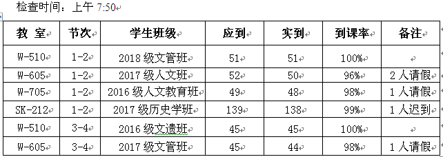为进一步规范教学管理,维护正常教学秩序,确保教学工作顺利开展,2019年2月25日,suncitygroup太阳新城教学自查小组对上课班级师生到课情况进行了检查,现通报如下: